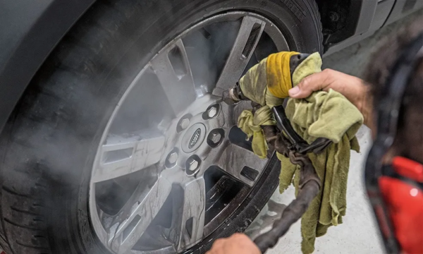 As rodas de liga leve, os pneus de perfil esportivo e as pinças de freio são detalhados com atenção especial. Além da limpeza profunda, aplica-se proteção contra poeira e contaminantes da pista.